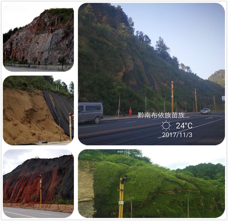 2015年貴州省荔波縣政府合作的“荔波縣景區(qū)道路邊皮項(xiàng)目,”典型喀斯特地貌不規(guī)則高陡邊坡生態(tài)復(fù)綠,“綜合纖維骨架高分子材料成功施工”應(yīng)用的經(jīng)典示范性工程。