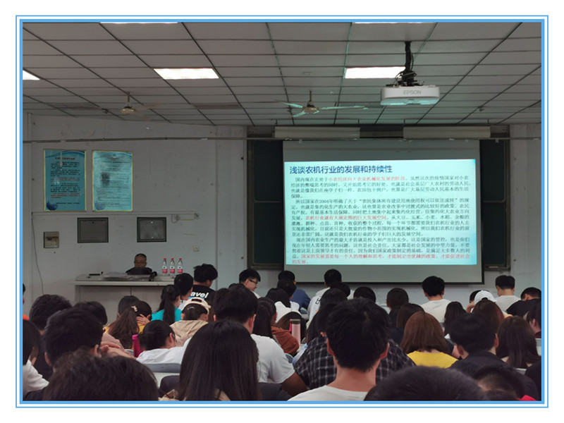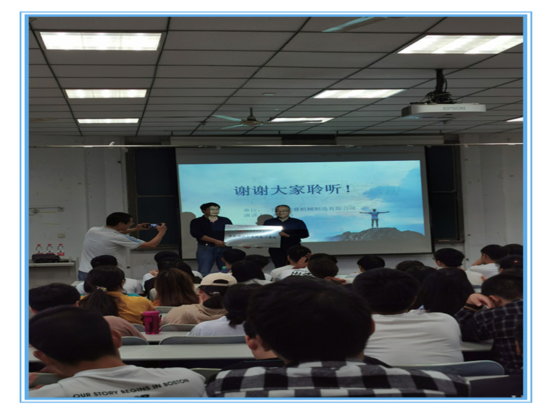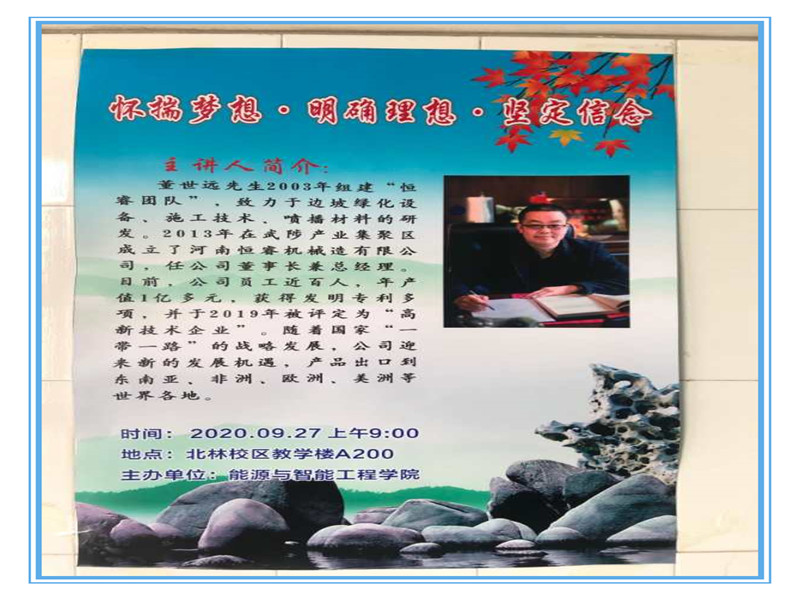 恒睿機械董世遠先生以《懷揣夢想?明確目標?堅定信念》為題,先介紹了他的人生經歷,告訴學子們要懷揣夢想;接著他介紹了他一手所建的恒睿噴播機廠發展歷程及現在規模,以及公司目前有的新一代邊坡綠化噴播設備自動智能化生產車間,告訴學子們機械行業需要他們這些學習能源與智能工程的人才;另外又講了恒睿未來五年發展計劃,就是做精做強本行業,成為行業佼佼者,同時在開辟一個新的領域,就是工業自動化產品;接著又淺談農機行業的發展和持續性,國內和國外形勢,最后對在座學子提出一些期望和建議,希望他們能多讀書,讀好書,以及堅定信念并努力向前!